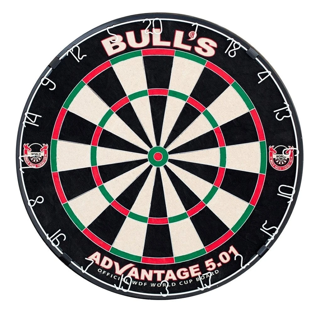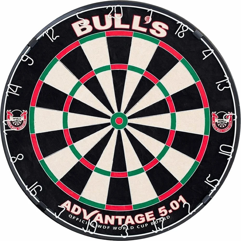 Dartboards – Bulls Advantage 5.01 Dartboard – Premium Quality. Now with stronger wiring. Made to the specifications of the World Darts Federation. World patented embedded Staple free Steel Bands. Bounceouts virtually eliminated by unique high Technology. Official World Cup dartboard of the WDF for many years. Powder Coated Number Ring to reduce reflections. Quite simply a stunning board. **Now also includes the Bulls rotating bracket**