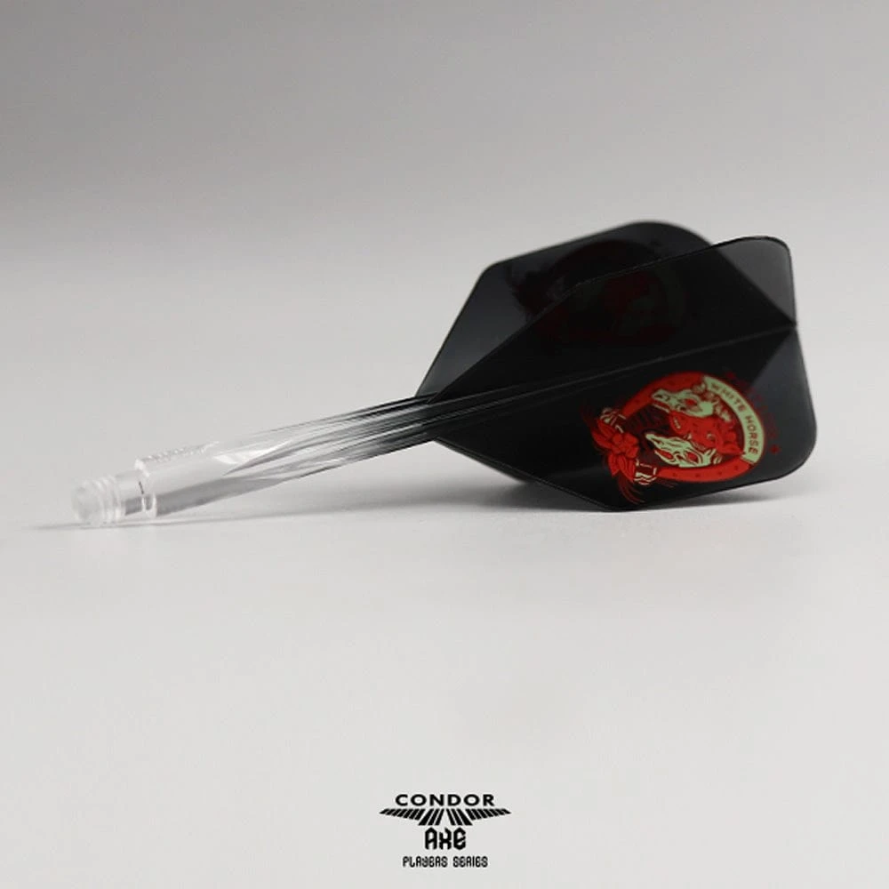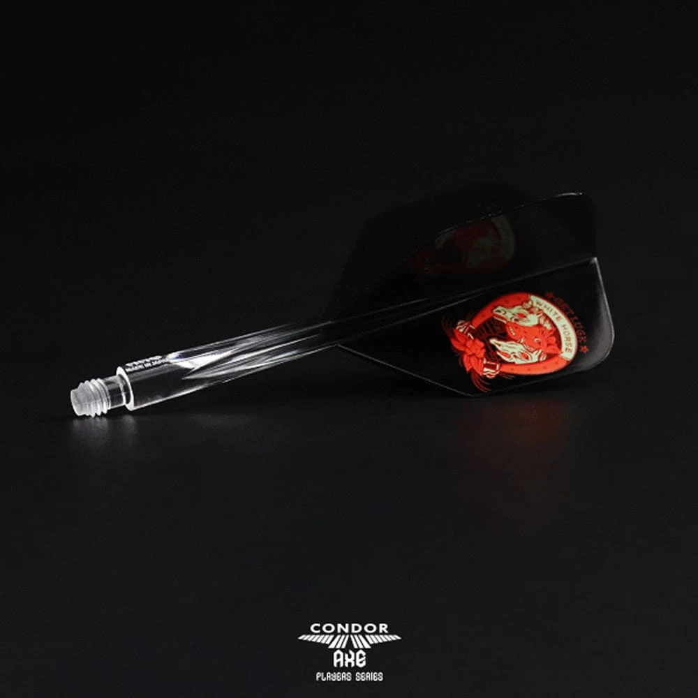 The Condor AXE player dart flights are designed to provide improved accuracy and stability in-flight. These clear black Small Standard flights with the Horseshoe design for Yuki Yamada are made from a durable polymer material and are available in 3 sizes. The long Horseshoe flights are measured from the ridge of the screw to the joint/link between the clear black Small Standard flights and the clear black long stem. Shaft length 33.5mm