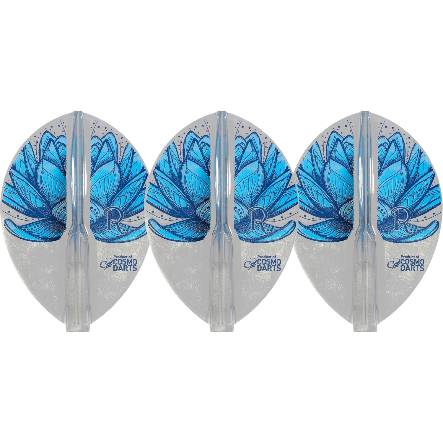 Cosmo Fit Flight AIR – Ren Kamata – Teardrop – Clear – Lotus Blue. These fit flight air models feature the collaborated designs from the player and the team at Cosmo. The AIR model is 30% thinner than the standard version. The flights are to be used with any Cosmo Fit Shaft. Each pack contains 3 flights.