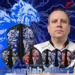 Cosmo Fit Flight Jeremiah Miller Standard shape dart flights. The Fit Flight is the most innovative Flight and Shaft System. Designed with Jeremiah Miller, these standard shape flights have a mixed colour Beast design on black flights. Only to be used with the Cosmo Fit Flight Shafts.