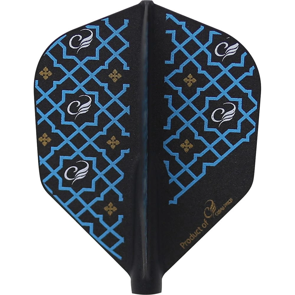 Cosmo Fit Flight Renaissance Blue Small Standard shape dart flights. The Fit Flight is the most innovative Flight and Shaft System. These small standard shape Renaissance Blue flights have a diamond design on a dark black background. To be used with the Cosmo Fit Flight Shafts.