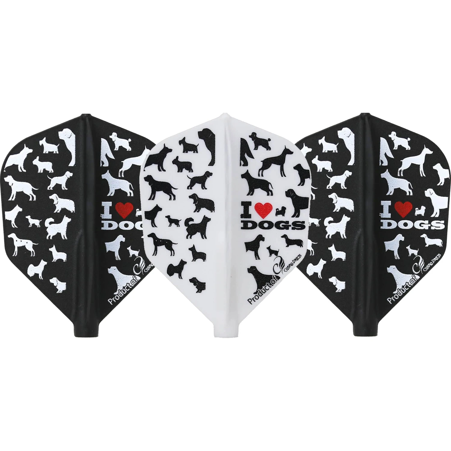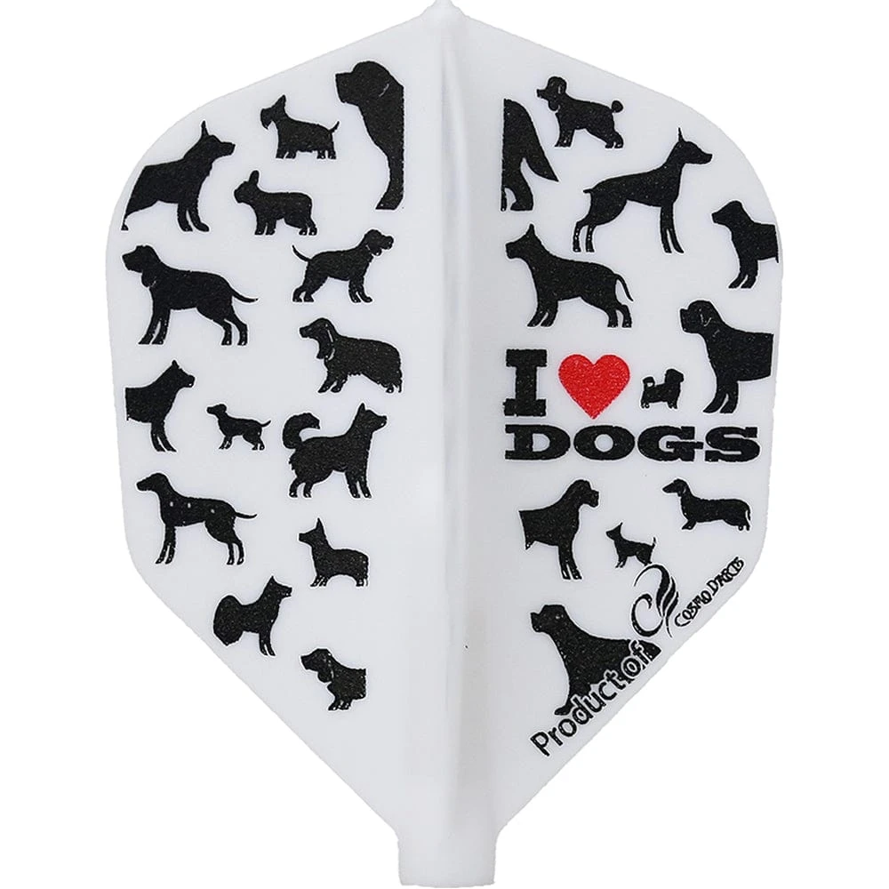 Cosmo Fit Flight I Love Dogs Small Standard shape dart flights. The Fit Flight is the most innovative Flight and Shaft System. These small standard shape I Love Dogs flights have a dog silhouette design on a mixed black and white background. To be used with the Cosmo Fit Flight Shafts.