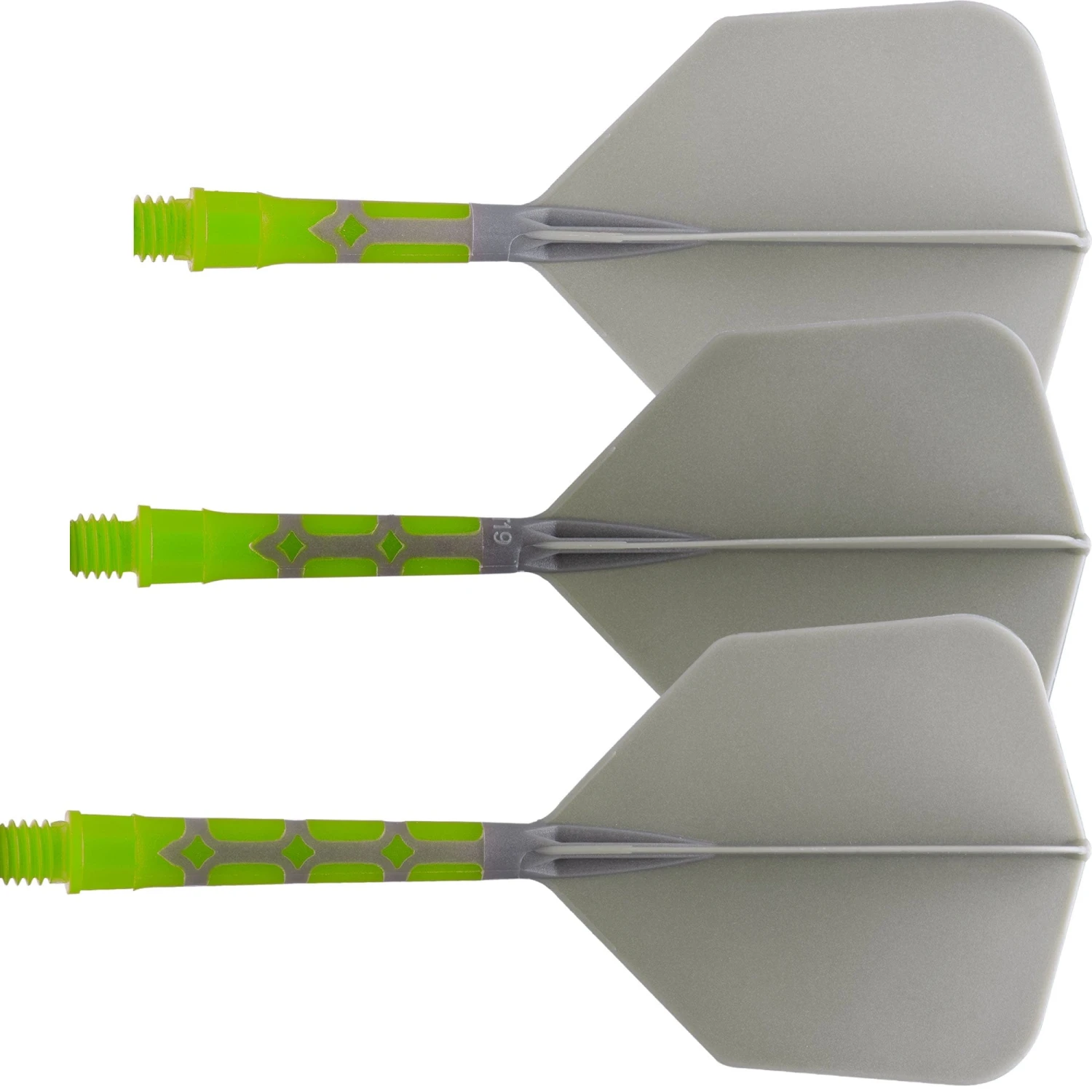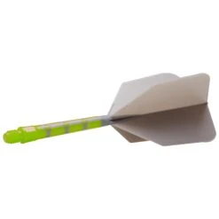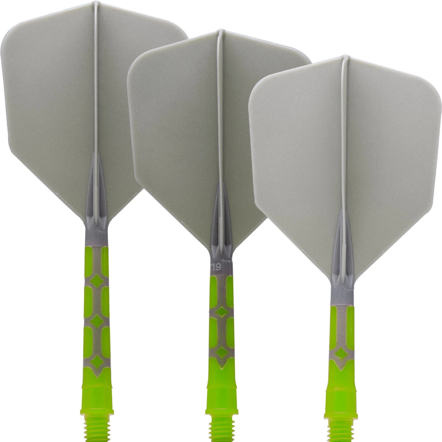 Cuesoul Rost T19 Integrated lime green dart shaft and big wing grey flights. This fully moulded system screws into the barrel, just as with a standard stem. The grey moulded flight features a reinforcing rib to help prevent Robin Hooding. The medium lime green dart shaft is measured for what is visible once the dart is assembled. Shaft length: 28mm