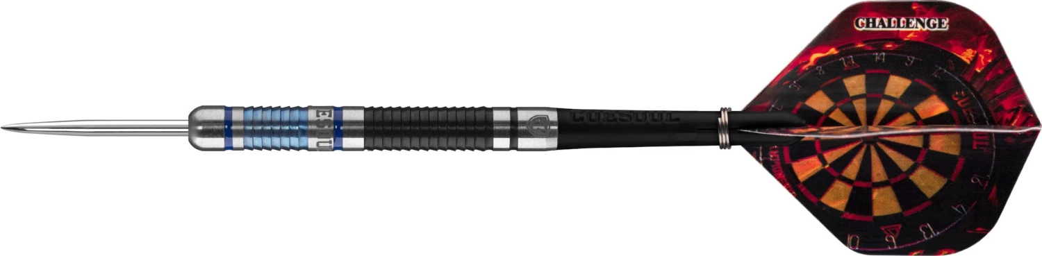 Cuesoul – Steel Tip Tungsten Darts – Challenge – Shark – Black & Blue – 24g. Contains 85% Tungsten Barrels, 2 sets of shafts and 2 sets of flights.