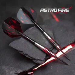 Darts Corner Astrofire – Steel Tip 90% Tungsten Darts. Features: 90 Percent Tungsten Barrels, Astrofire Dart Flights and Dart Shafts. Darts Corner Astrofire Darts – Steel Tip – Knurled – Black & Red – 22g Centre weighted darts which have a really good balance.