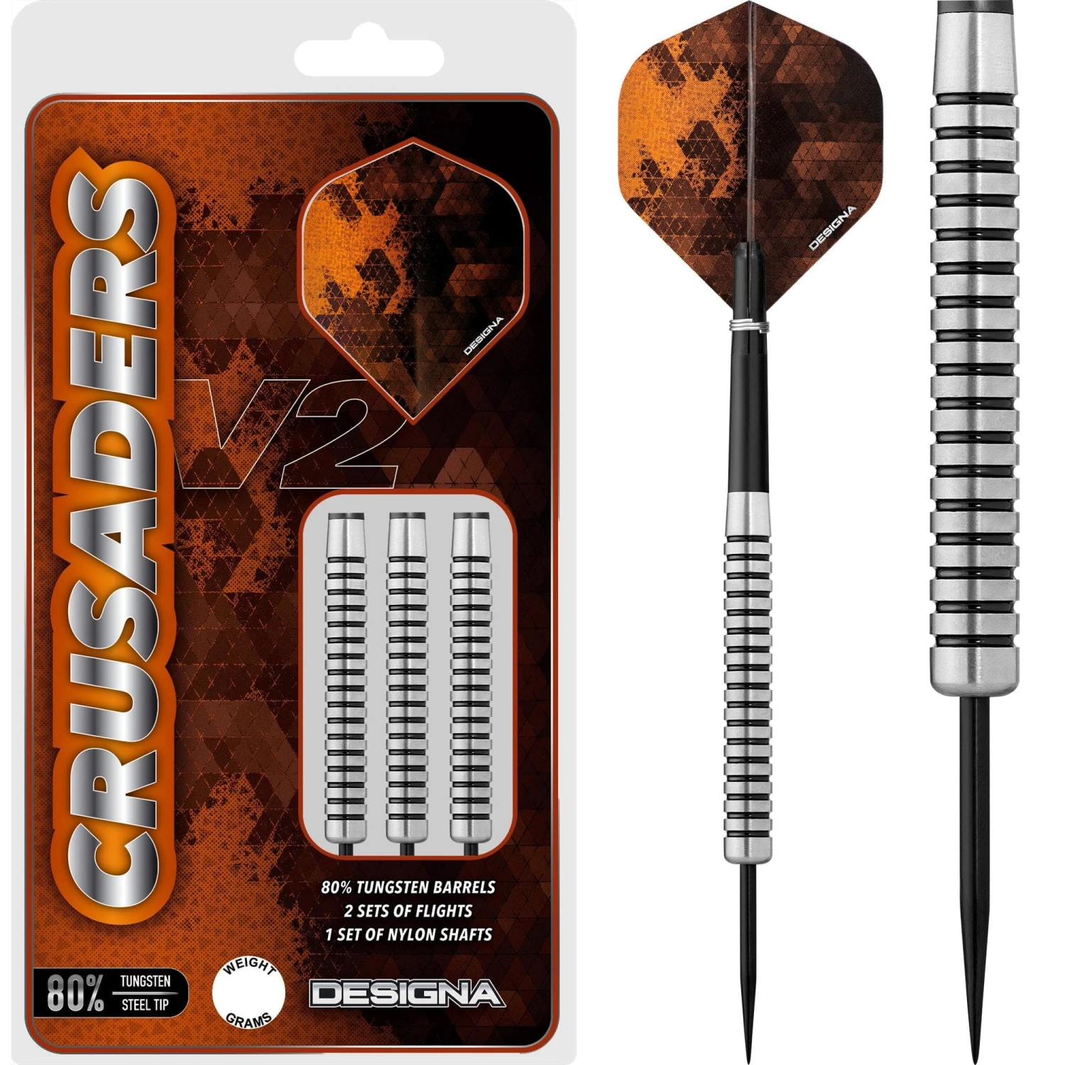 Designa Crusader V2 Steel Tip Darts – 80% Tungsten. Quality 80% Tungsten Darts. Includes: 2 Sets of Designa Flights, 1 Set of Nylon Shafts with rings, Point Protector.
