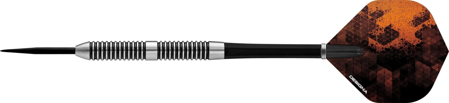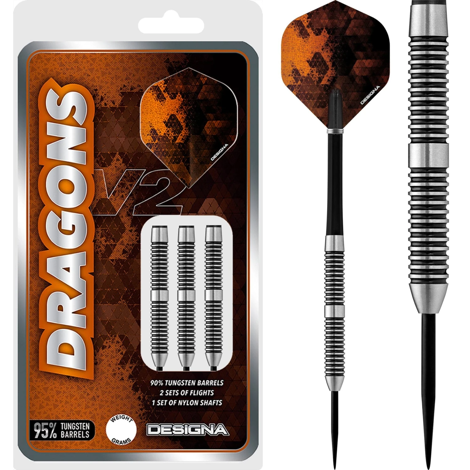 Designa Dragon 95 V2 Steel Tip Darts – 95% Tungsten. Quality 95% Tungsten Darts with a distinctive Ringed grip. Includes: 2 Sets of Designa Flights, 1 Set of Nylon Shafts with rings, Point Protector.