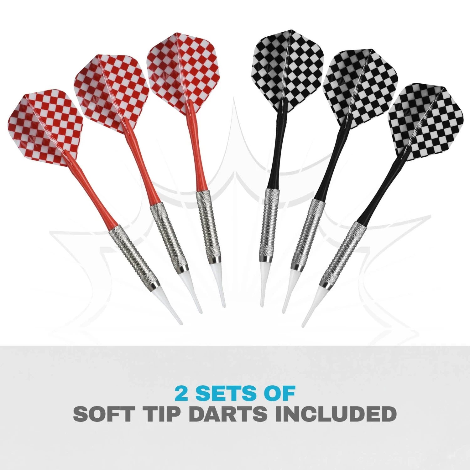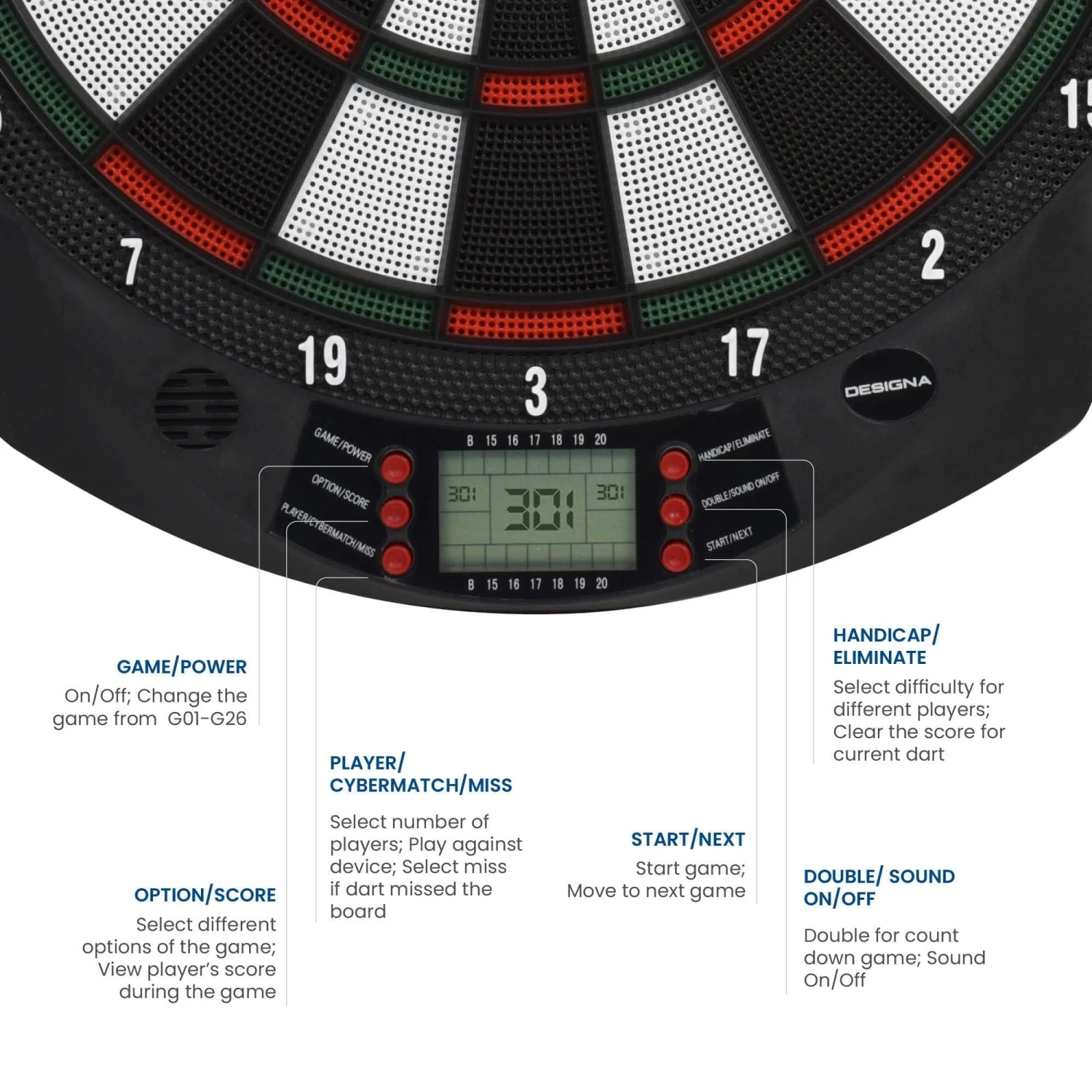 The Designa Electronic Dartboard is great fun and the perfect introduction to soft tip darts! This dartboard comes with 26 different games (and 185 variations of these games) and interactive sounds to add to the fun. There are two sets of soft-tip darts and up to 8 players can play at the same time!