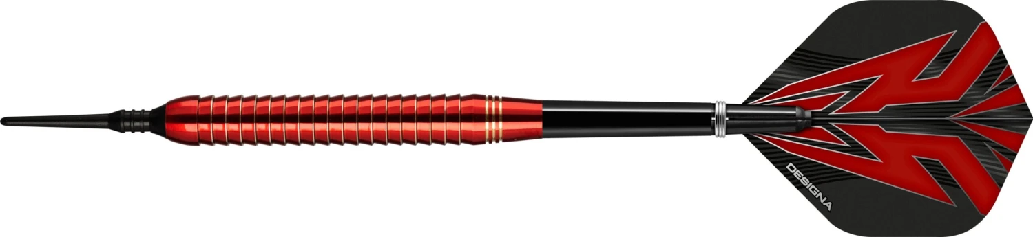 Designa Mako Soft Tip Electro Brass Darts. Quality Brass Soft Tip Darts. Includes: 2 Sets of Designa Flights, 1 Set of Nylon Shafts with rings, Point Protector. Designa Mako Darts – Soft Tip Electro Brass – Shark Grip – Red