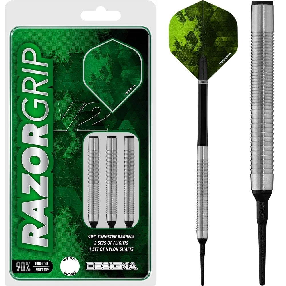 Designa Razor Grip V2 Darts – 90% Soft Tip Tungsten Darts. Features: 90% Tungsten Barrels, 2 Sets of Designa Flights, 1 set of Nylon Shafts, Point Protector.