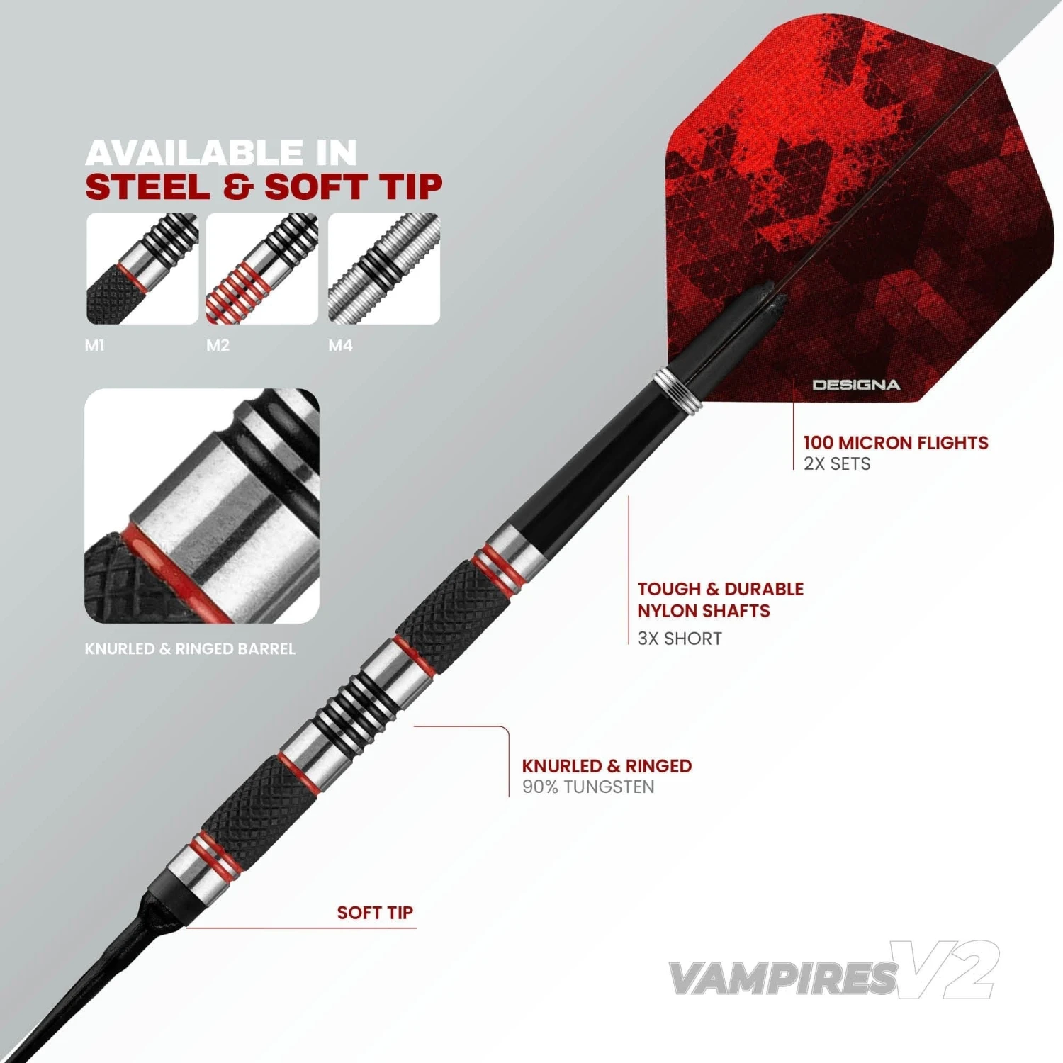 Designa Vampires V2 Soft Tip Darts – 90% Tungsten. Quality 90% Tungsten Darts. Includes: 2 Sets of Designa Flights, 1 Set of Nylon Shafts with rings, Point Protector. Designa Vampires V2 Darts – Soft Tip – M1