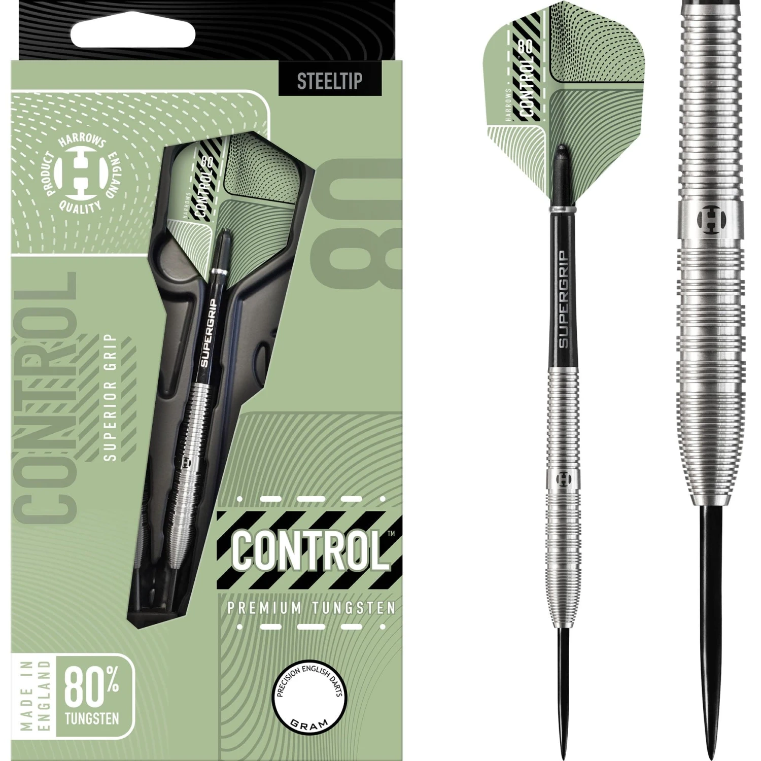 Harrows Control Tapered Darts – Steel Tip – 80% – Ringed – 24g. These 80% Tungsten barrels have been carefully designed to create a superior grip for ultimate control. The dart is available in 2 barrel shapes to be suitable to every dart player. Each set comes complete with a set of Harrows Supergrip shafts and a set of Control flights.