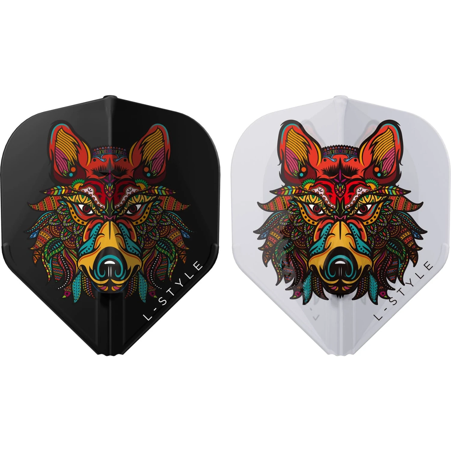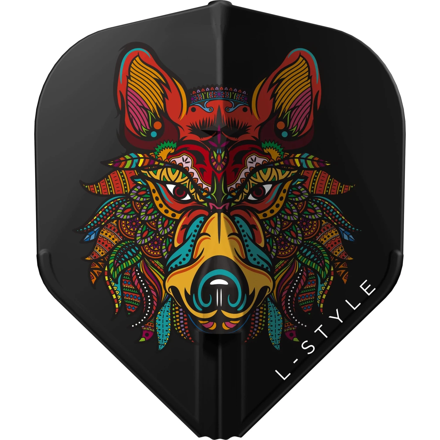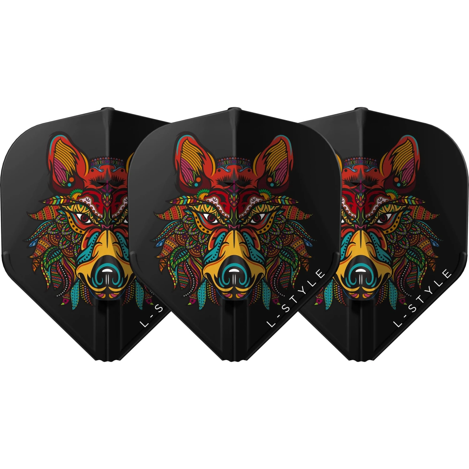 L-Style – EZ L-Flights – Integrated Champagne Ring – L1EZ – Almudena v1 – Black. The 1st Edition of the Almudena flights – Standard shaped. A very colourful and detailed picture on the popular EZ fully integrated dart flight. Each pack contains 3 flights.