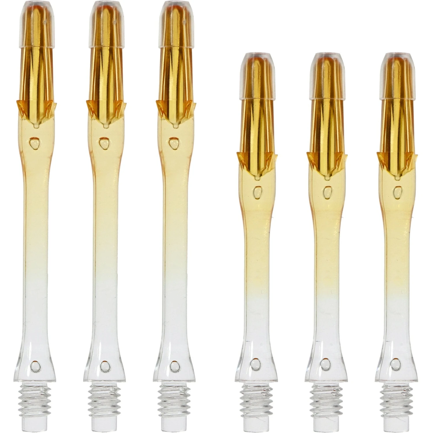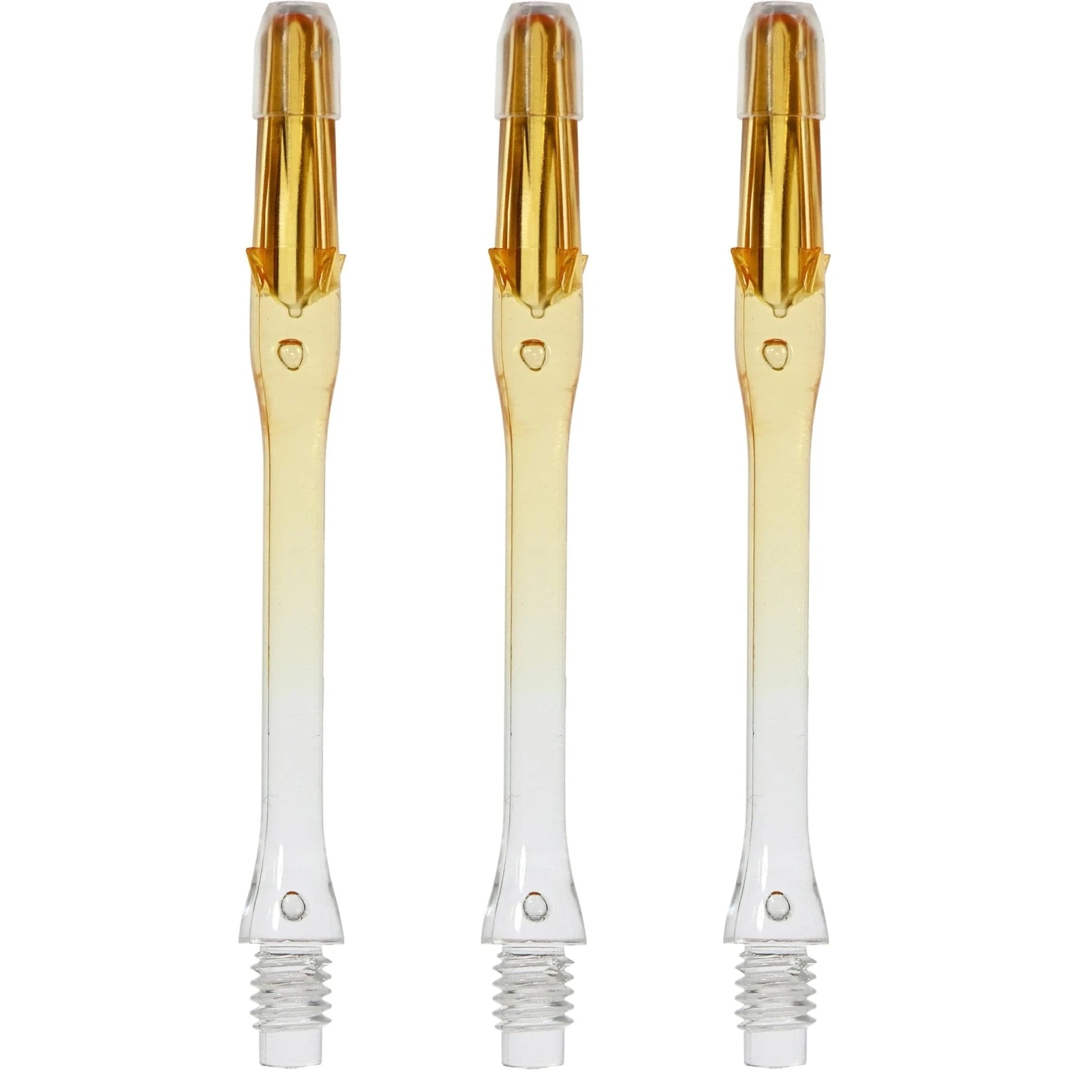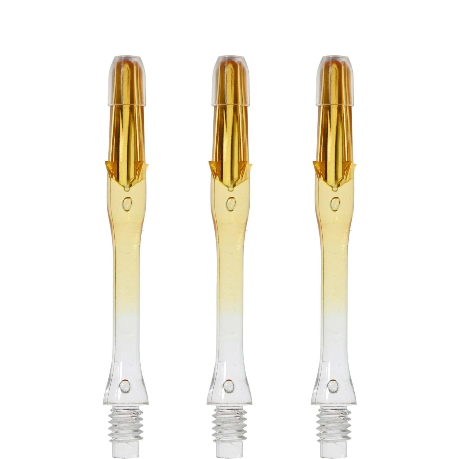 L-Style L-Shafts – Silent Spinning. Japanese material manufacturing technology. Precision moulded, for accurate 2ba thread form. The flights work best when using the Shell Lock Rings or the Champagne Rings as these help lock everything together to create a very strong hold. Measurement is taken from the top of the thread to the bottom of the slits. Each pack contains 3 shafts plus a set of champagne rings. L-Style – L-Shafts Gradient – N9 – Locked Slim – Orange