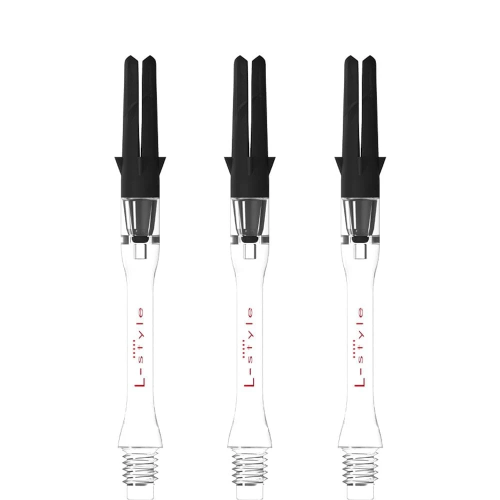 L-Style L-Shafts – Carbon – Silent Slim Spinning. Japanese material manufacturing technology. Precision moulded, for accurate 2ba thread form. The flights work best when using the Shell Lock Rings or the Champagne Rings as these help lock everything together to create a very strong hold. Measurement is taken from the top of the thread to the bottom of the slits. Each pack contains 3 shafts plus a set of champagne rings.