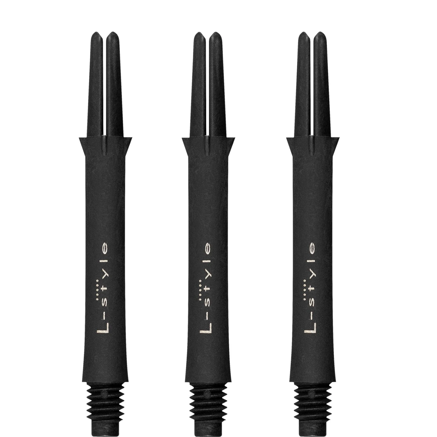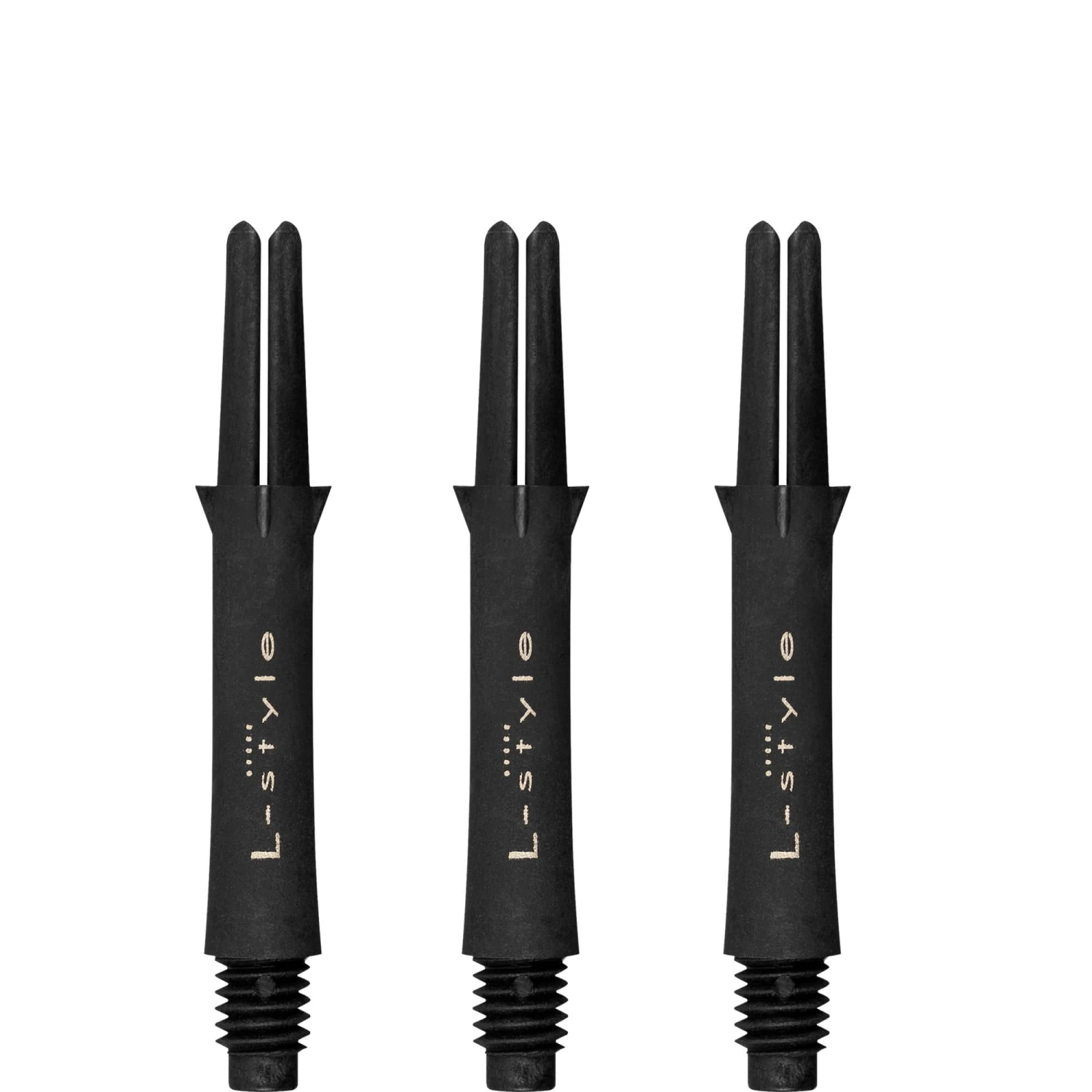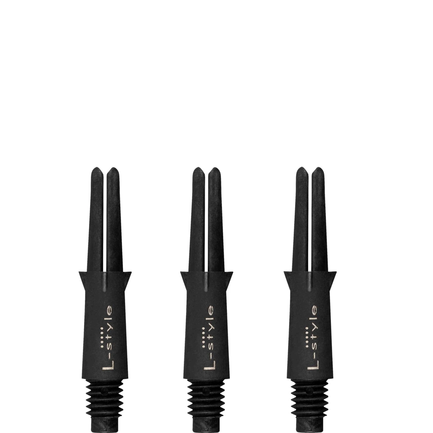 L-Style L-Shafts – Carbon – Straight Locked. Japanese material manufacturing technology. Precision moulded, for accurate 2ba thread form. The flights work best when using the Shell Lock Rings or the Champagne Rings as these help lock everything together to create a very strong hold. Measurement is taken from the top of the thread to the bottom of the slits. Each pack contains 3 shafts plus a set of champagne rings.