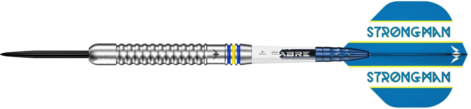 Mission Dennis Nilsson Darts – Steel Tip – 95% Tungsten – Silver-25g . Show your strength on the oche with these Dennis Nilsson Darts. Nicknamed ‘Strongman’ from his days as a bodybuilder, Sweden’s Dennis Nilsson has forged a successful career in darts and reached the semi-finals of the 2023 WDF World Championships. Nilsson’s first darts from Mission are made from 95% tungsten and feature a bull nose design. The ringed grip straight barrel design includes radius radial grooves along the length of the barrel and are finished off with blue and yellow painted rings, a nod to the colours on the Swedish flag. The barrel leads to a clear Mission Sabre shaft with a blue top which keeps the flight firmly in place. The dart is complete with a black point and the Mission logo is laser-etched into the barrel.
