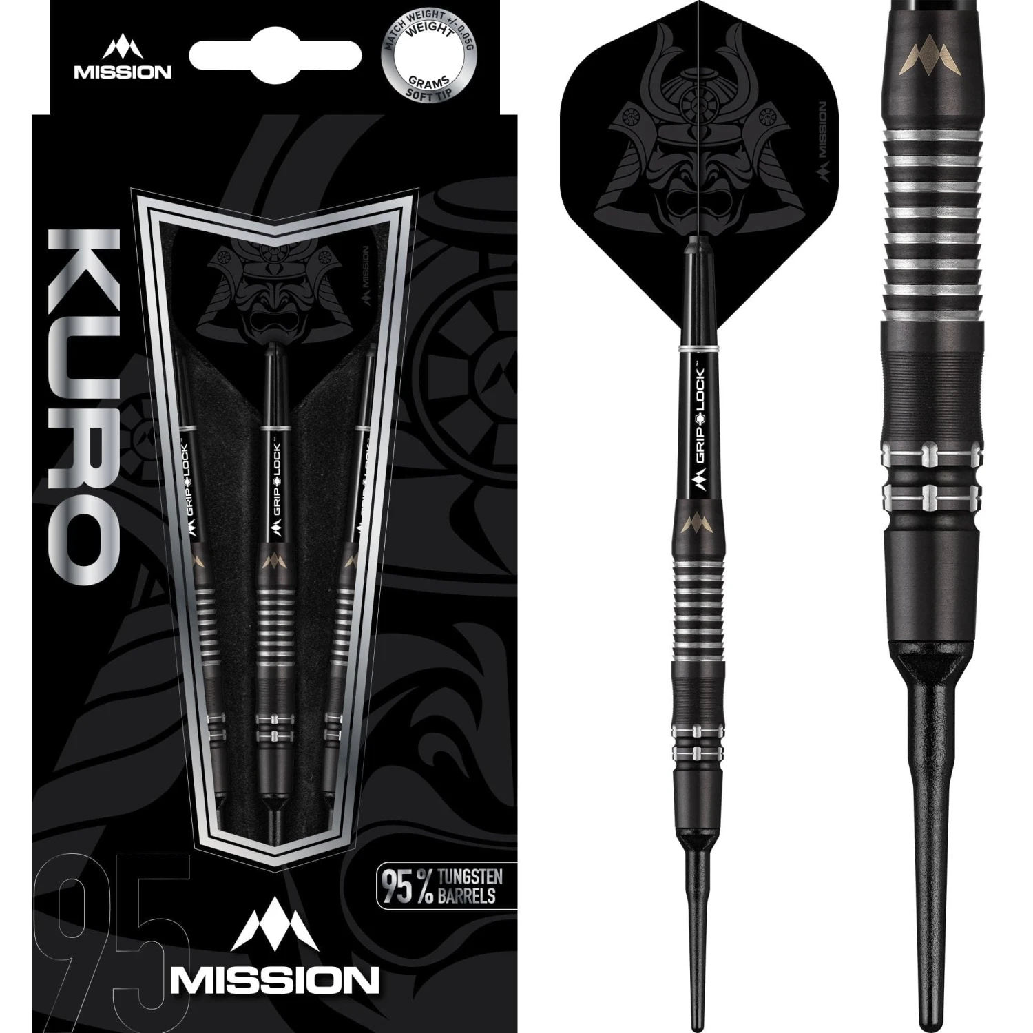 Mission Kuro Soft Tip Tungsten Darts – 95% Tungsten. Features: 95% Tungsten Barrels, 1 Set of Mission Flights, 1 Set of Mission Shafts with S-Lock rings, Point Protector. Barrel Weight of 19.5g, leading to a fully loaded weight of approx 21g. Mission Kuro Darts – Soft Tip – Black – M2 – Razor Scallop – 21g-D9173