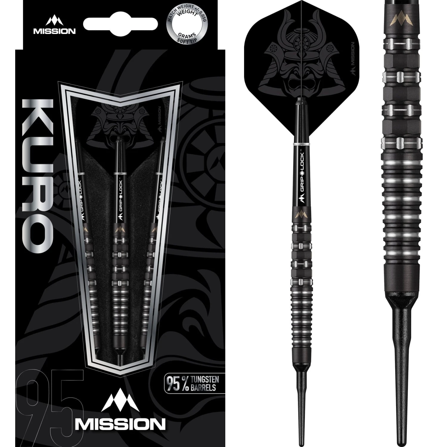 Mission Kuro Soft Tip Tungsten Darts – 95% Tungsten. Features: 95% Tungsten Barrels, 1 Set of Mission Flights, 1 Set of Mission Shafts with S-Lock rings, Point Protector. Barrel Weight of 20.0g, leading to a fully loaded weight of approx 22g. Mission Kuro Darts – Soft Tip – Black – M3 – Rear Iso-Grip – 22g-D9176