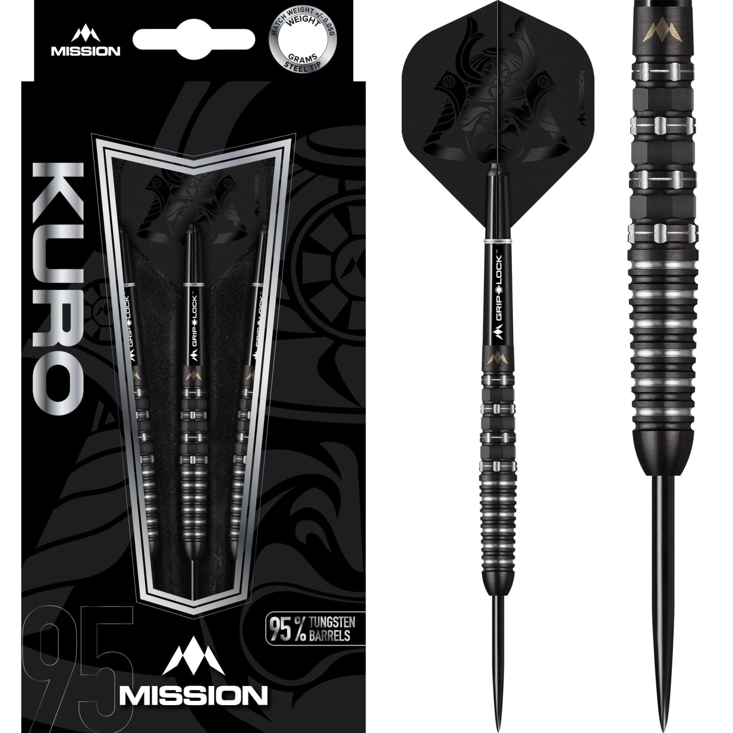 Mission Kuro Steel Tip Tungsten Darts – 95% Tungsten. Features: 95% Tungsten Barrels, 1 Set of Mission Flights, 1 Set of Mission Shafts with S-Lock rings, Point Protector. Mission Kuro Darts – Steel Tip – Black – M3 – Rear Iso-Grip – 24g-D5395 Black Coating.