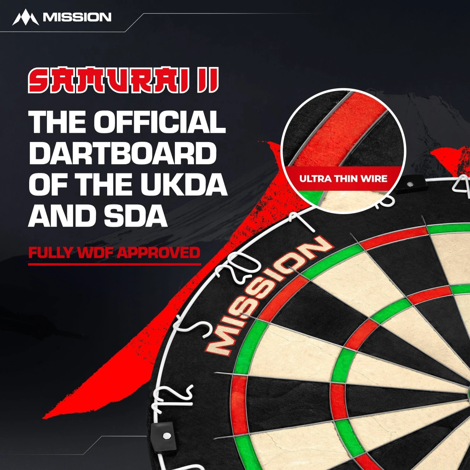 The Mission Samurai II is a competition standard top-quality dartboard with an ultra-thin wire construction. This board is the official dartboard of the UKDA, the SDA and is fully WDF approved, so is the perfect choice for any serious player. The sharp angle of the ultra-thin wires enables darts to glance over them and into the scoring areas, resulting in less bounce outs and damage to the darts. The Mission Samurai II (Samurai 2) dartboard is manufactured from high-quality African sisal and features a staple-free construction and vibrant non-fade colours. The design is completed with bold Mission branding. Mission Samurai II Dartboard – Ultra Thin Wire – Professional Board