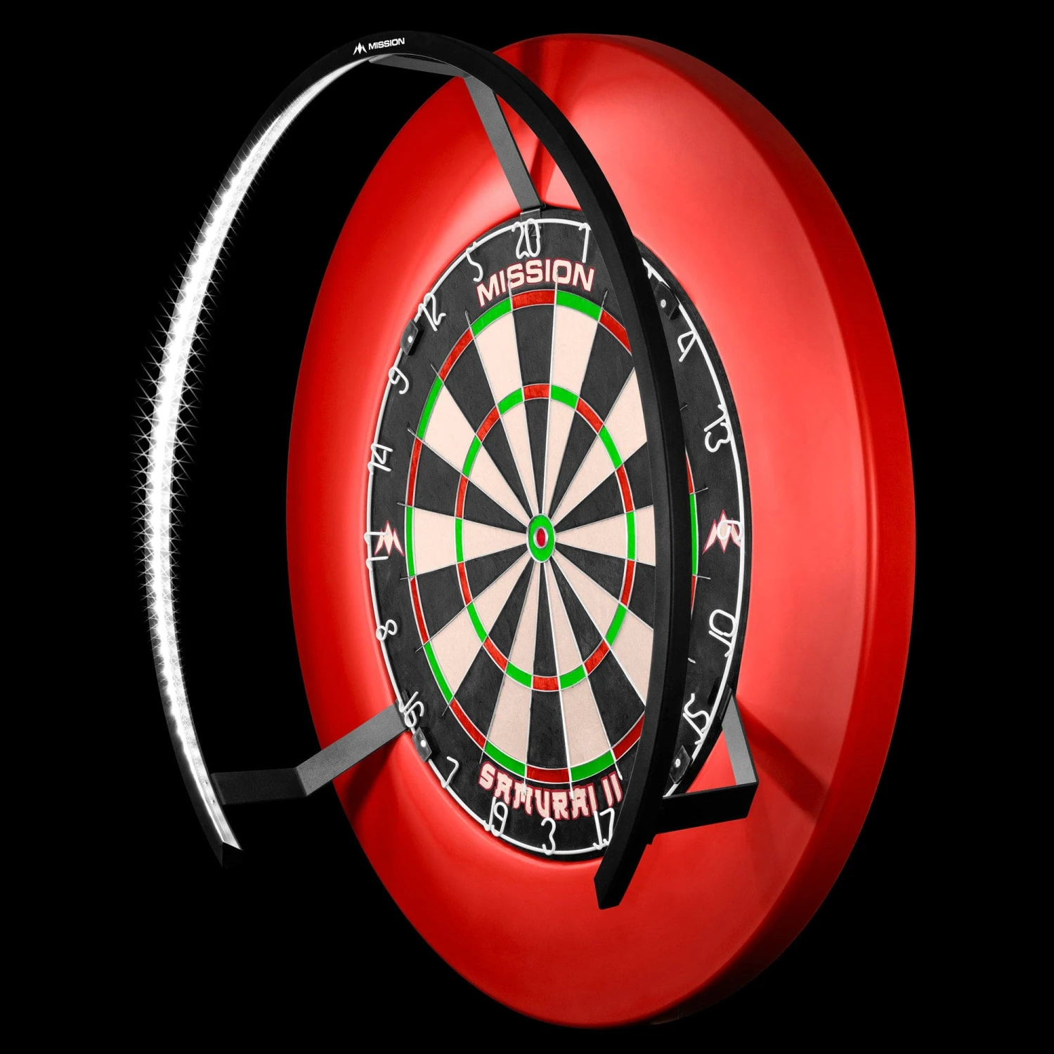 The Torus 270 is a simple way to light your dartboard, without shadows, to improve your vision of the board. The lighting system quickly clips to any dartboard and the unique 270-degree shape gives you easy access to retrieve your darts during play which is ideal for youth players. The lightweight frame features bright white LED lights to illuminate the entire dartboard, all without casting shadows or dazzling players. No matter what existing lighting you have in the room, the Torus 270 dartboard light creates continuous light over your board. In this unique design, the inside edge of the light rail is tilted 25 degrees outwards to allow even more light to reach the board. Once installed your Torus 270 wont moved if knocked. The simple fixings clips firmly onto the dartboard, which means you can use the Torus 270 dartboard light with any bristle board, with a board and surround, or even in a dartboard cabinet. Installation is very simple; use the Allen key provided to fasten the legs to the light frame, and then effortlessly clip the light to your dartboard. Simple! Mission Torus 270 Dartboard Lighting – Bright White Light – ALSO INCLUDES TORUS CLAMP.