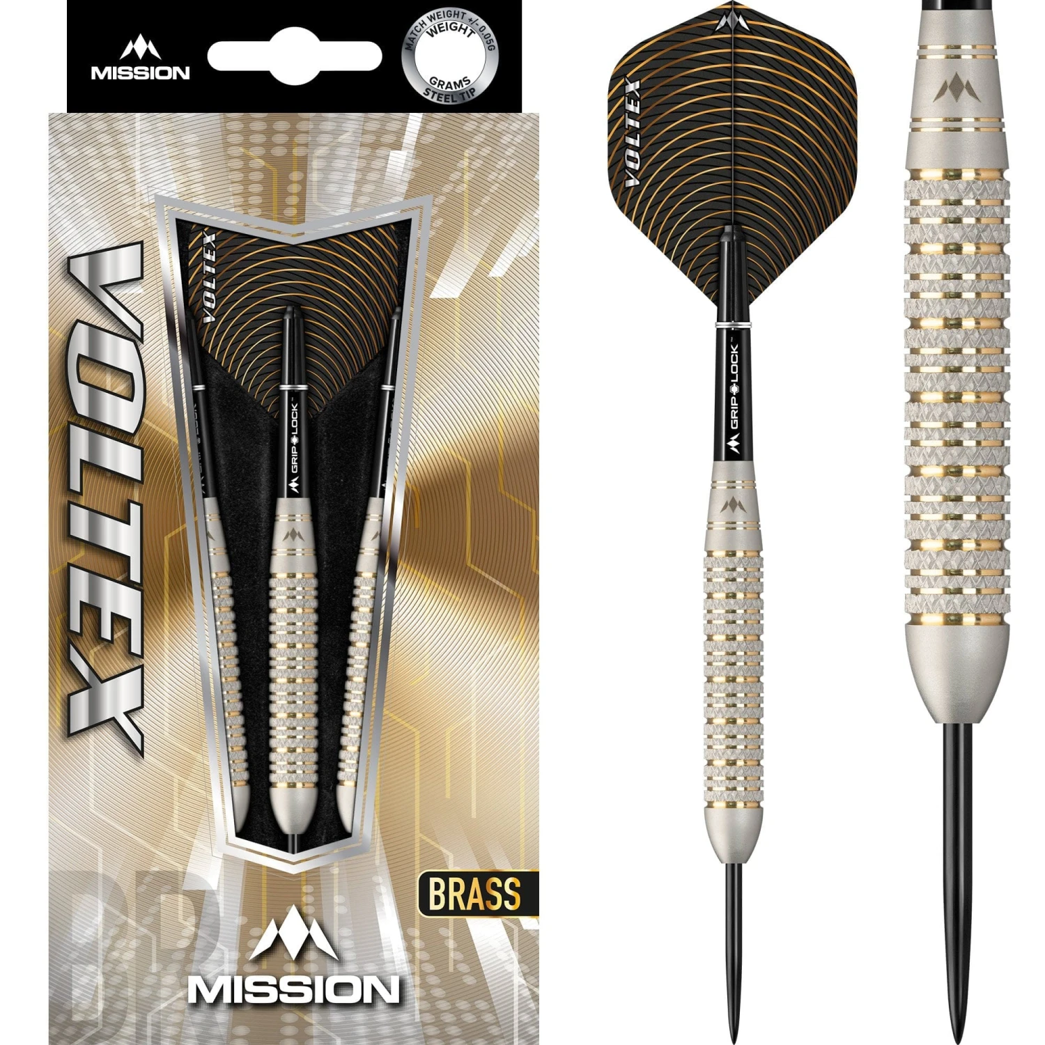 Mission Voltex Steel Tip Brass Darts – Electro Silver. Features: Electro Coated Brass Barrels, 1 Set of Mission Flights, 1 Set of Mission Shafts with S-Lock rings, Point Protector. Mission Voltex Darts – Steel Tip Brass – M2 – Silver – Knurled – 23g-D1585