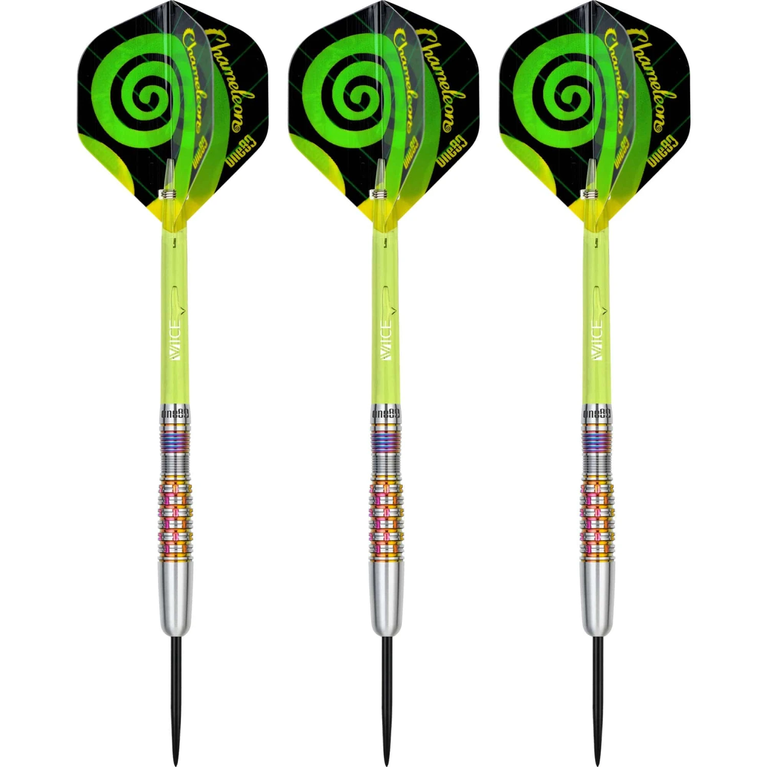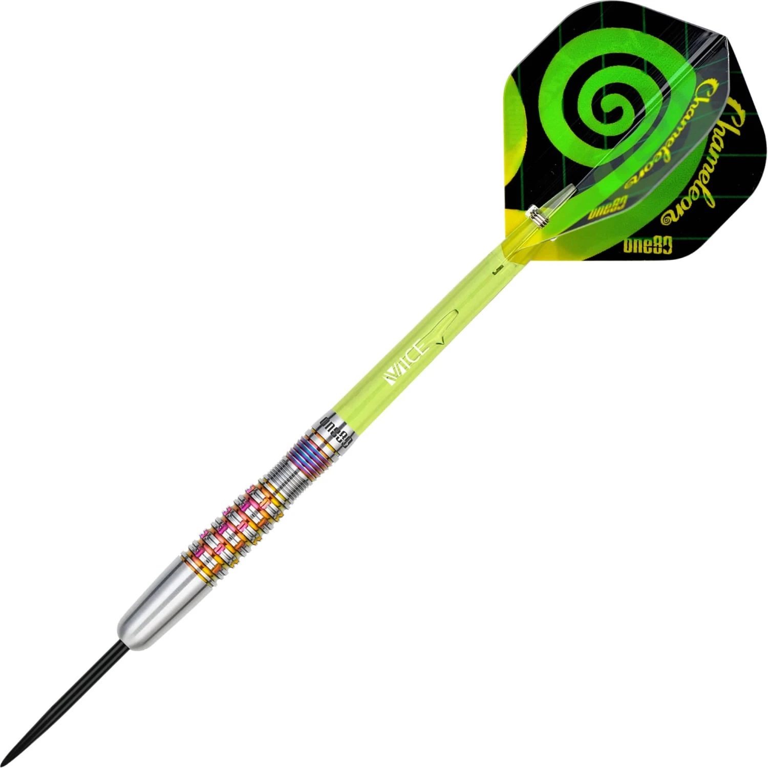 One80 Chameleon Darts – Steel Tip – Apatite – 23g. A new addition to the Chameleon range, the Apatite are straight barrels with alternating milled cuts to the rings of the barrel. The rainbow coated, ringed section to the rear also features a slight scallop.