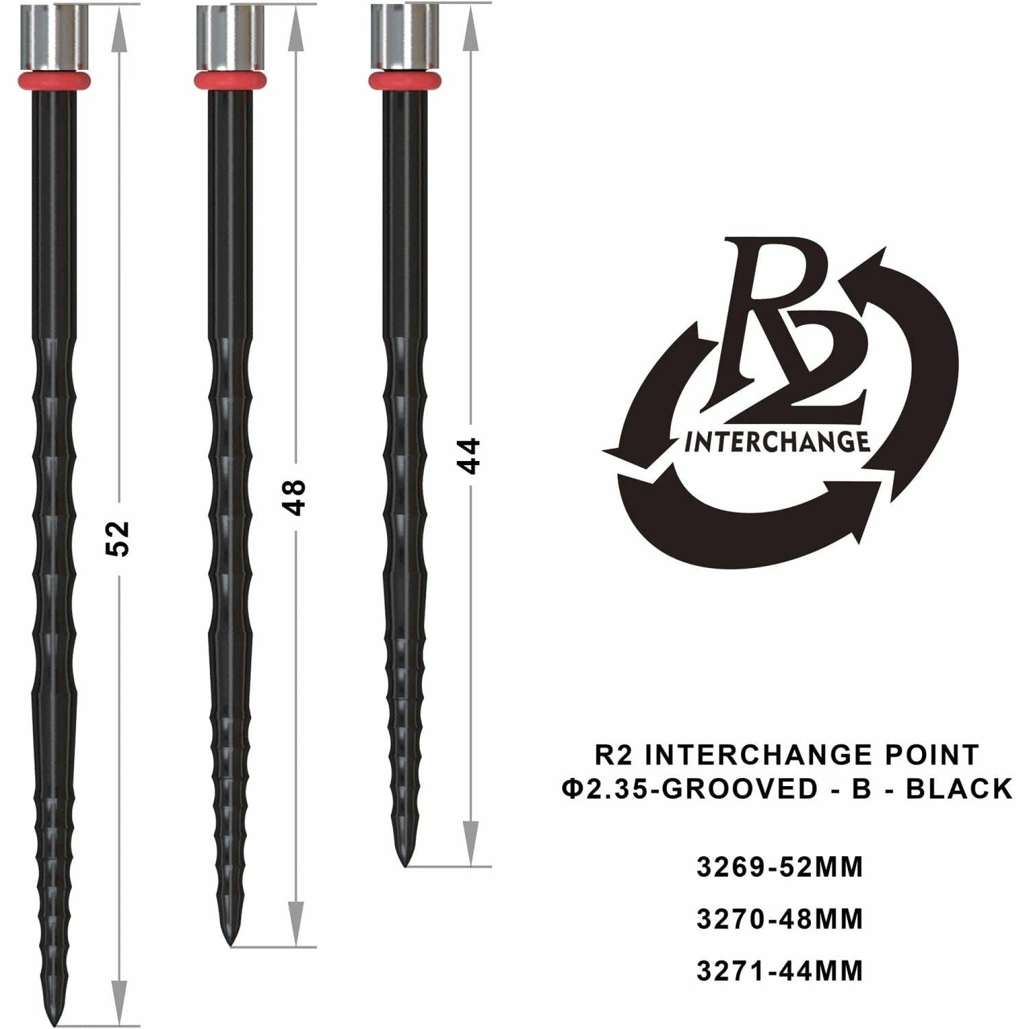 One80 R2 Interchange Points (2.35mm) – 44mm – Grooved – B – Black. Each pack contains 3 points for use with R2 Darts,