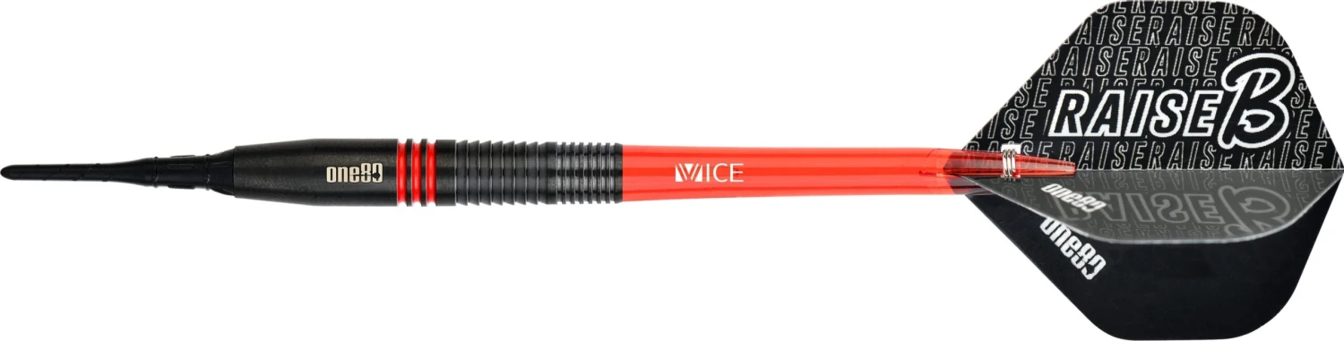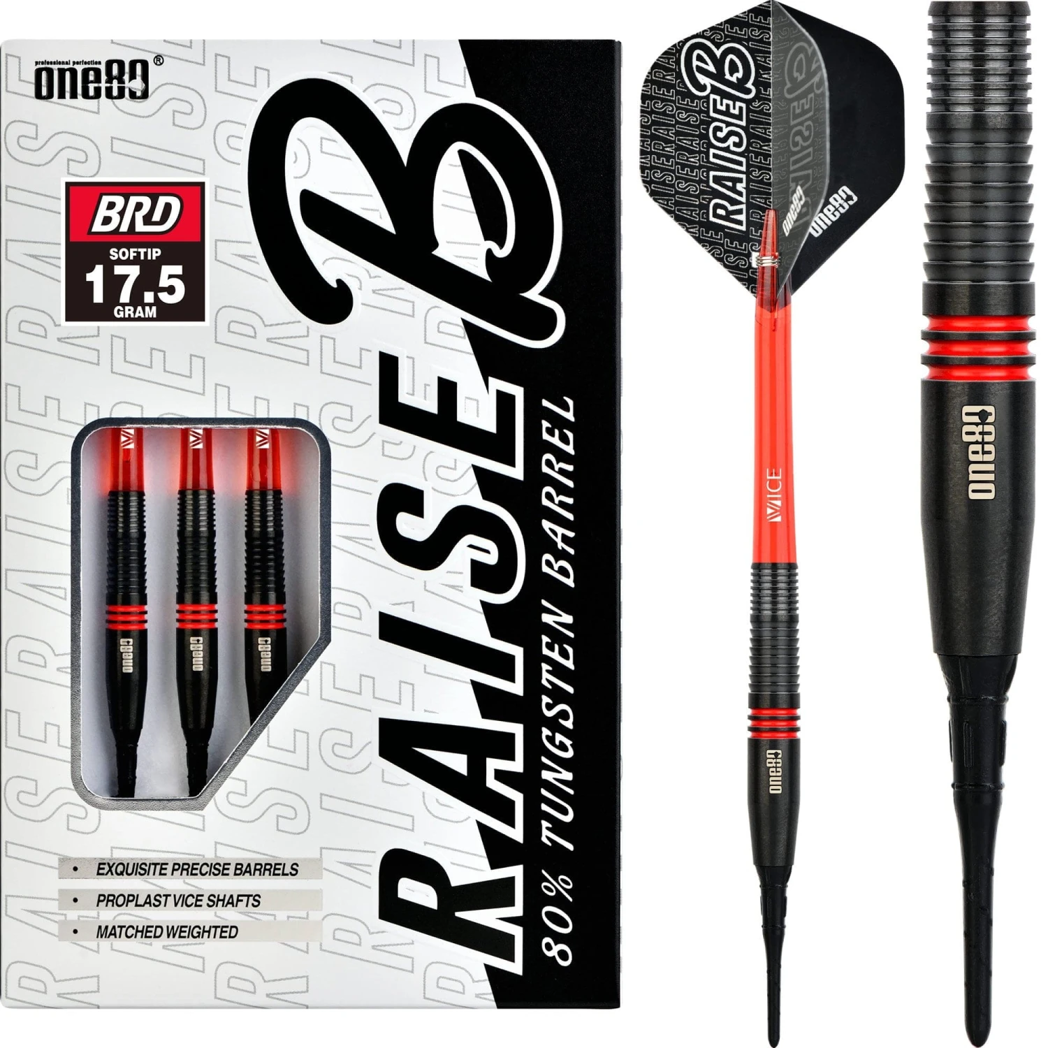 One80 Raise B Soft Tip Tungsten Darts. Features: HD (High Density) Tungsten, Matched Weighted, Set of Nylon Shafts, Set of One80 Flights One80 Raise B Darts – Soft Tip – Black – Red Rings