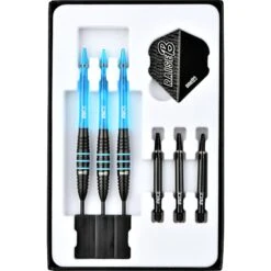 One80 Raise B Steel Tip Tungsten Darts. Features: HD (High Density) Tungsten, Matched Weighted, Set of Nylon Shafts, Set of One80 Flights One80 Raise B Darts – Steel Tip – Black – Aqua Blue Rings