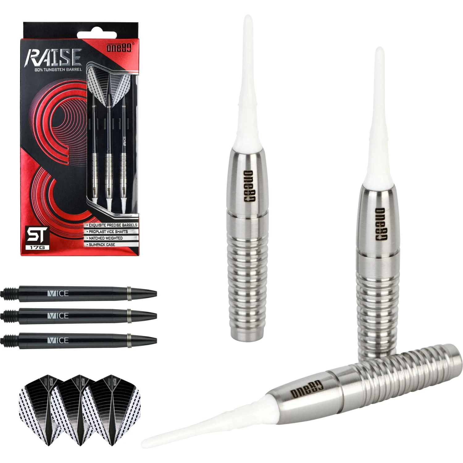 One80 Raise Soft Tip Tungsten Darts. Features: HD (High Density) Tungsten, Matched Weighted, Set of Nylon Shafts, Set of One80 Flights One80 Raise ST Darts – Soft Tip – Ringed