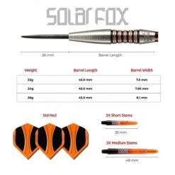 The Solarfox V1 steel tip darts have a Scallop barrel made from 90% Tungsten with Black & Orange highlights, finished with an etched Perfect Darts logo. This stylish and durable darts set includes everything you need. The compact dart case comes with 6 flights in two designs, 6 two-tone polycarbonate stems in two sizes (short and medium) with springs and a point protector. The 6 standard shaped flights have been specifically designed to complement this set. Available in 22g, 24g and 26g. Perfect Darts – Steel Tip – 90% Tungsten – Solarfox 1 – Scallop – Black & Orange – 22g
