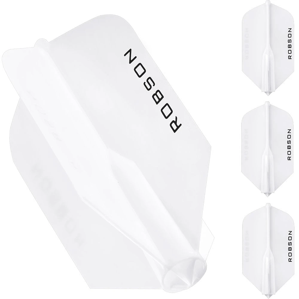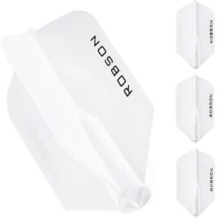 Robson Plus Slim Shape Dart Flights. Made from a moulded plastic, these white flights simply push onto your normal shaft to give you a solid professional setup. As the flights do not have a specialist fitting, these white slim flights can be used on most nylon and aluminium shafts. Each pack is provided as one set of 3 flights.