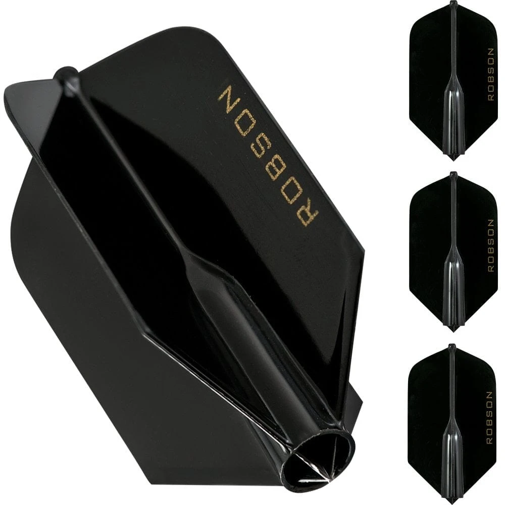 Robson Plus Slim Shape Dart Flights. Made from a moulded plastic, these black flights simply push onto your normal shaft to give you a solid professional setup. As the flights do not have a specialist fitting, these black slim flights can be used on most nylon and aluminium shafts. Each pack is provided as one set of 3 flights.