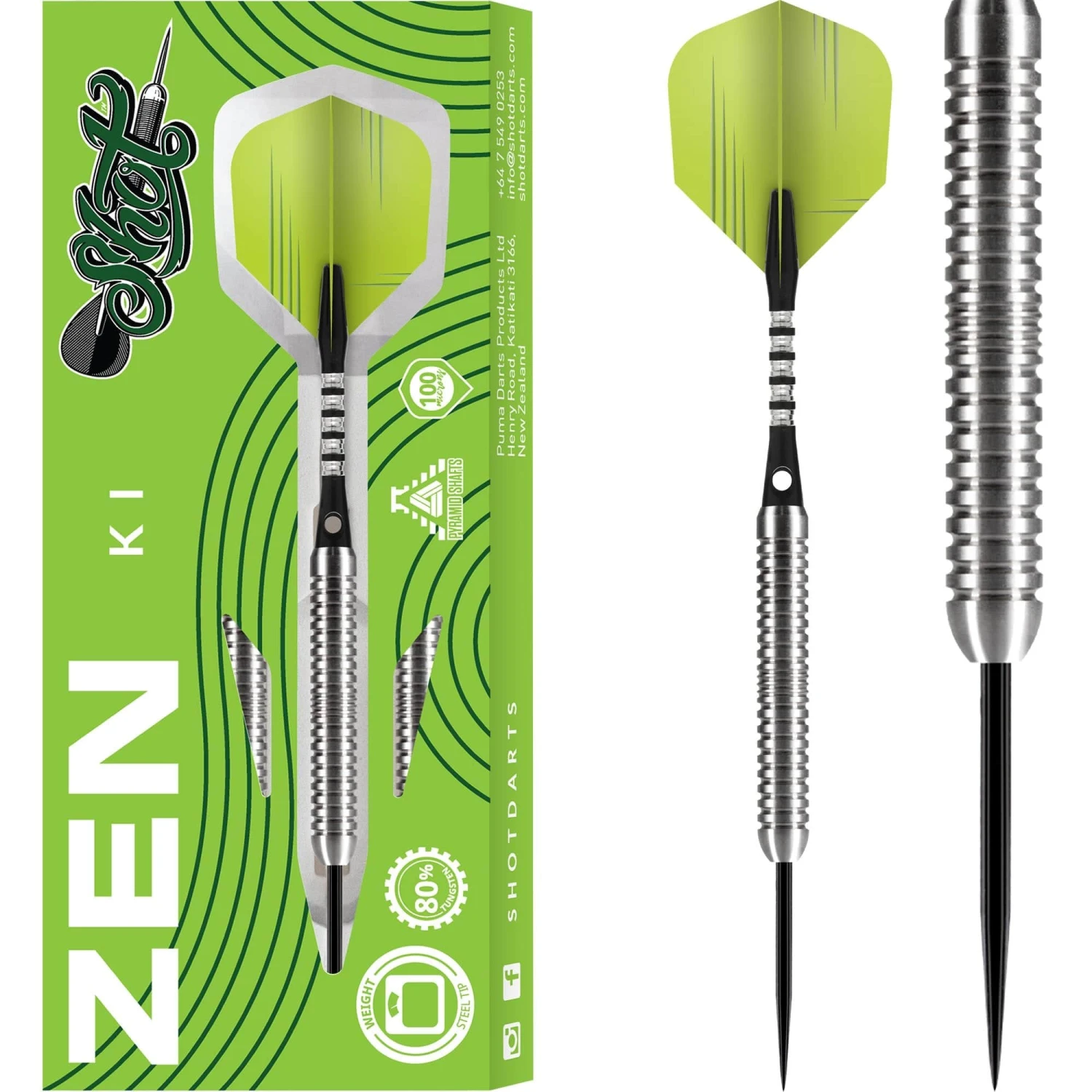 Shot Zen Series – Ki 80% Steel Tip Tungsten Darts. Features: 80% Tungsten Barrels, Shot Flights, Shot Shafts.