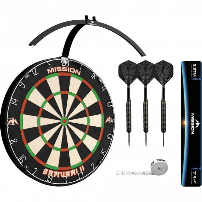 Starter Bundle ‘L’ – With Travel Light Looking for a complete darts kit that’s perfect for beginners or great as a gift? This bundle comes with EVERYTHING you need, including the all-important darts, a professional dart board, a dartboard light, plus a Toeline to throw from and many other essentials! The Designa Mako steel tip darts are a great quality all-rounder suitable for most players, with a Shark Grip brass barrel electroplated in black to give a stylish black and brass finish. They come with two sets of Designa Flights, two sets of Nylon Shafts (1 Short and 1 Medium) with rings, so you can experiment, plus a Darts Wallet, Point Protector and a Check Out Card. The Mission Samurai II is a professional level dartboard and the official dartboard of the UKDA and the SDA and is fully WDF approved, so you know it will last! This bundle also comes with the Mission Torus 100 travel light, which is easy to clip to your dartboard and folds away small when it’s not in use. We’ve even included a Mission Toeline to throw from, and a Mission Measuring Tape to make sure everything is in just the right place! This complete bundle totals £90.75 when bought as separate items, but together as a bundle you’re getting a great deal. This Starter Bundle ‘L’ (with Travel Light) includes: •Mission Samurai II dartboard •Mission Torus 100 Folding Portable Travel Light •Designa Mako darts (Black, 22g, Brass) + 2 sets of flights, 2 sets of shafts •Mission Toeline •Mission Measuring Tape •Check Out Card Thinking your aim might be off? – Think about adding a Surround to your set-up to protect the area around the board or look at our bundles which include surrounds.tester