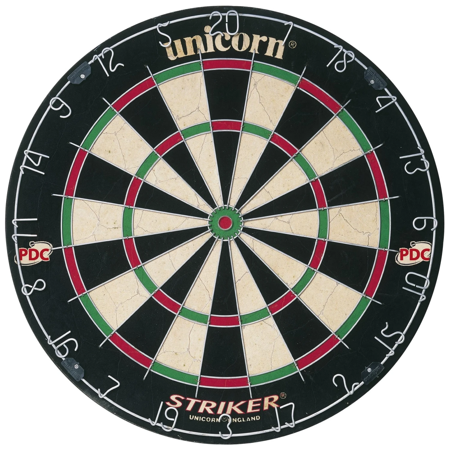 Unicorn Striker Dartboard. Features: Competition quality bristle board, PDC Endorsed, World Champions endorsements, High quality round wire construction, SuperSlim wire fasteners to increase playing area, Staple-free Bullseye, FREE Checkout Chart.