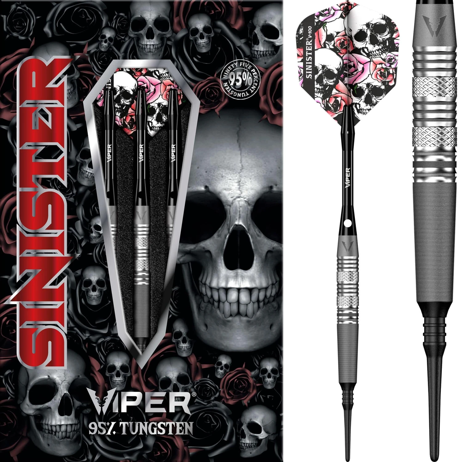 Viper Sinister Darts – Soft Tip – 95% – Sandblasted – S5 – Twin-Knurl – 18g. These new Viper Sinister darts feature a unique sandblasted section at the front and rear of the barrel. Each series has its own unique grip along the centre of the barrel to creat a perfect dart suitable across everyones ideal grip. Includes Viper shafts and flights.