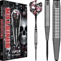 Viper Sinister Darts – Steel Tip – 95% – Sandblasted – S1 – Shark Grip – 22g. These new Viper Sinister darts feature a unique sandblasted section at the front and rear of the barrel. Each series has its own unique grip along the centre of the barrel to creat a perfect dart suitable across everyones ideal grip. Includes Viper shafts and flights.
