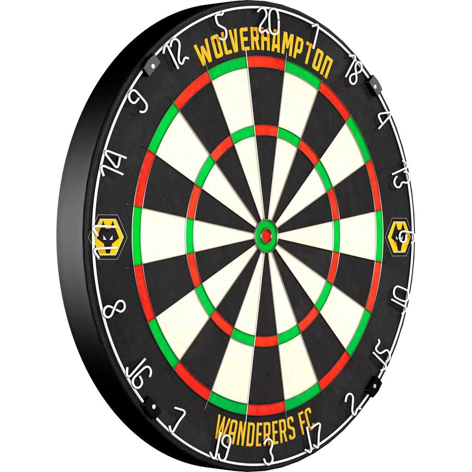 Wolverhampton Wanderers Football Club Professional Dartboard is a competition standard top-quality dartboard with an ultra-thin wire construction. The sharp angle of the ultra-thin wires enables darts to glance over them and into the scoring areas, resulting in less bounce outs and damage to the darts. This Wolves dartboard is manufactured from high-quality African sisal and features a staple-free construction and vibrant non-fade colours. Wolverhampton Wanderers Football Club Dartboard – Official Licensed – Wolves – Yellow Crest